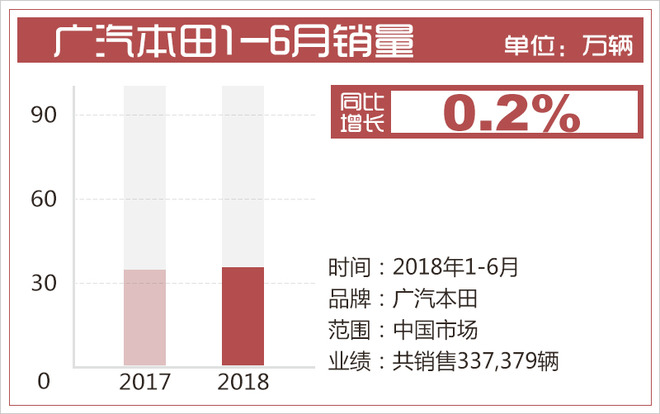 1-6月份销量排名第7位的广汽本田的成绩是337,379辆,与去年同期相比没有太大变化,同比增长0.2%。2018年是广汽本田的20周年,为了给品牌注入源源不断的全新动力,广汽本田计划在2018年推出5款以上的新车。据悉,全新一代雅阁锐·混动将于2018年第三季度上市。另外广汽本田或将在今年推出由缤智打造而来的纯电动版车型。