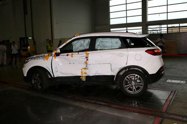 在侧面碰撞测试中,在速度为50km/h的台车的冲击下,在车门防撞梁、B柱、门槛梁等刚强度结构的保护下,其侧面车身变形量不大,没有影响到车内乘员的生存空间。最终,猎豹CS9顺利得到了满分。