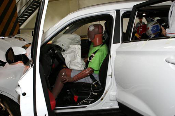 C-NCAP之所以设定了多种碰撞工况,就是为了全面考核车辆的被动安全性能。在正面100%碰撞试验中,车辆以50km/h的速度与刚性壁障直接碰撞。该试验要能有好的表现,其车身结构要有较好的吸能特性,同时又要避免变形量过大;同时,车身结构和安全带、安全气囊等约束系统的碰撞响应须具有良好的匹配特性。