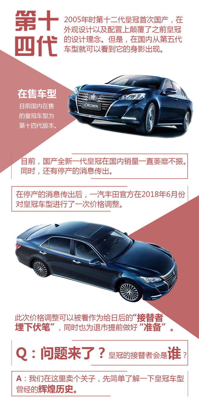 丰田皇冠作为最早进入中国市场的进口豪华轿车之一,在国人心中具有着较高的知名度。现如今,皇冠在国内经历了十四代更迭依然得到消费者的认可,实属不易。不过,随着时代的变化以及竞争对手不断推陈出新,皇冠逐渐淡出了消费者的视野。近期,皇冠退市的消息已经传开,当我们听到这个消息时,除了惊讶以外还想知道,日后谁能来取代“常青树”的空缺?