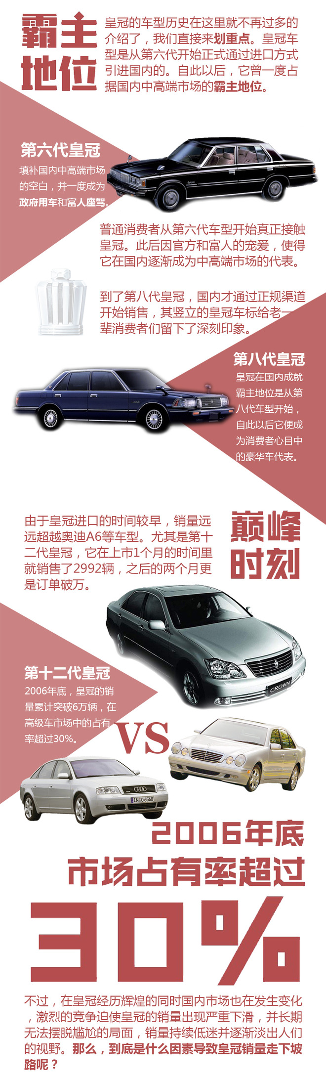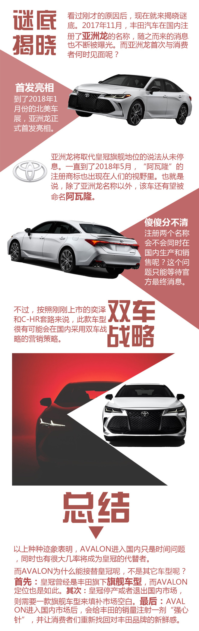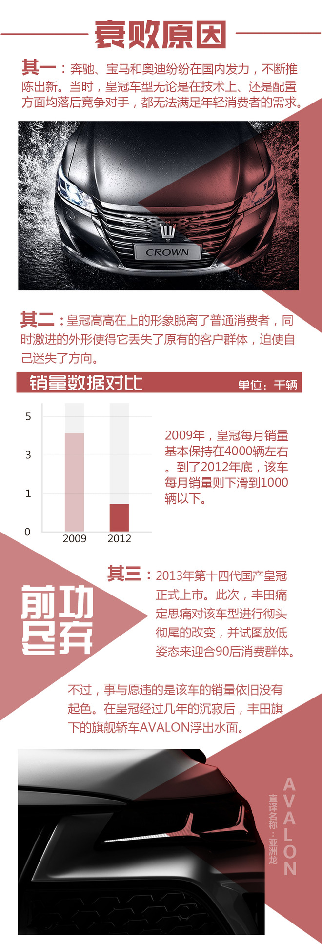 写在最后:皇冠在国人心中有着举足轻重的地位,但是因为销量等因素促使它不得不退出历史舞台。不过,丰田并不想放弃国内的中高端市场,就算皇冠真的停产了,AVALON也会第一时间进入中国市场,填补皇冠“离去”造车的市场空白。同时,还很有可能采取双车战略,广汽丰田和一汽丰田共同销售进一步抢夺市场份额。虽然,丰田目前还没有最终确认皇冠以及AVALON的消息,但是我们会持续关注并第一时间作出后续报道。(图/文 网通社 赵淳)