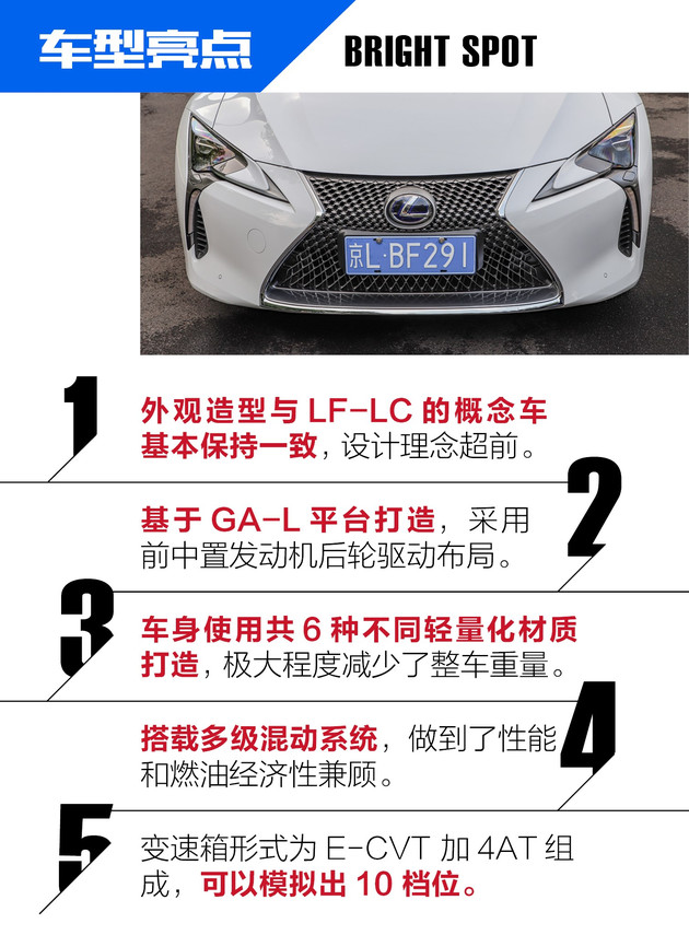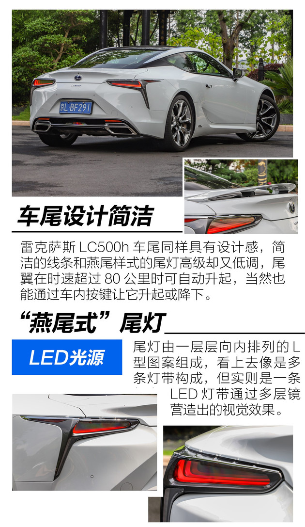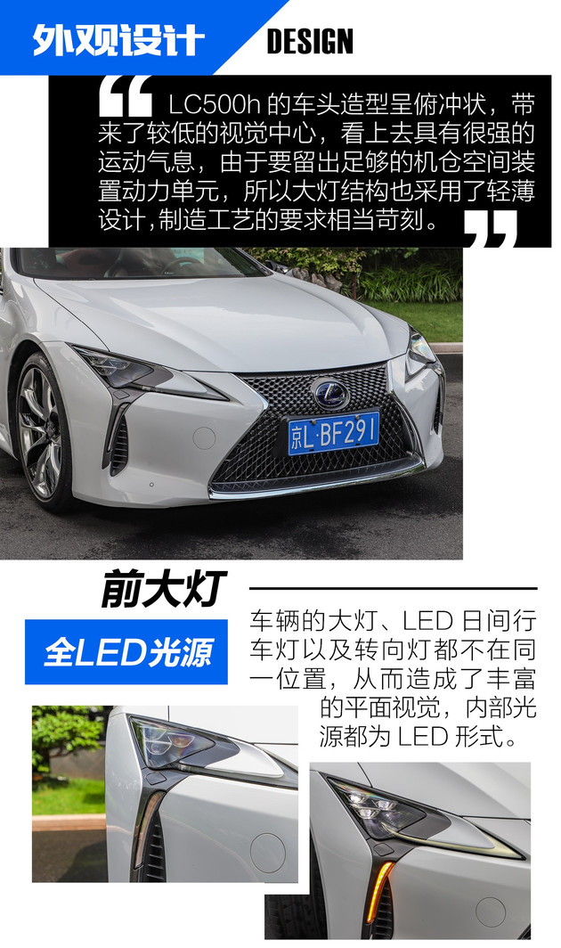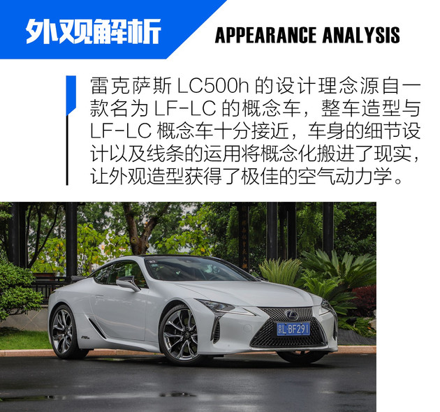 雷克萨斯LC500h的外观和LF-LC概念车极度相似,可以说是完全照搬,特别是车辆的前后灯组造型,延续了概念车的细节设计,深邃的尾灯结构,视觉效果颇为惊艳,这对工程制造水平提出了更高的要求,不仅如此,车头的设计、线条的运用等一系列细节化的设计,让人不得不敬佩设计师的匠心独运。