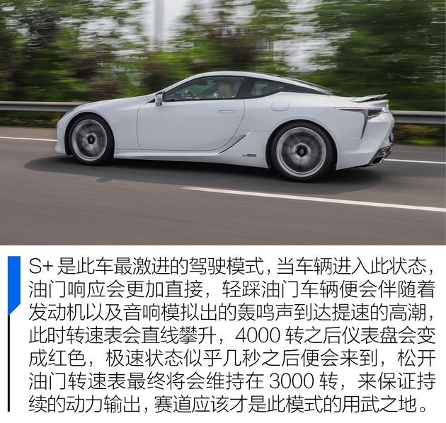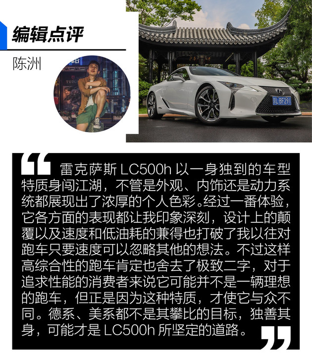 大多数车迷总是习惯以极速、加速时间、排量、战斗气息等数据和工艺的极致性来作为衡量一辆高素质跑车的标准,而作为日系豪华跑车,雷克萨斯LC500h就像是一个顽固保守却又匠心独运的侠客,带着强烈的个人秉性身闯江湖,它无心与德意系跑车掐秒计时争夺加速时间,也没有美系性能车大排量自吸的粗狂,静中求速、柔中带钢是其推崇的风格,正如中国传统的太极拳法,小隐于野,大隐于市。