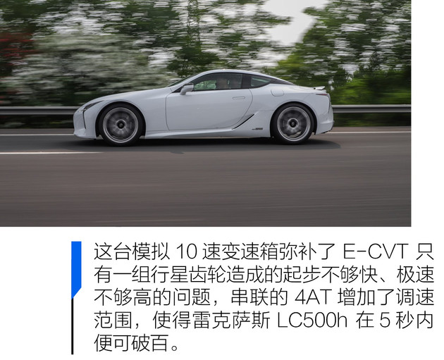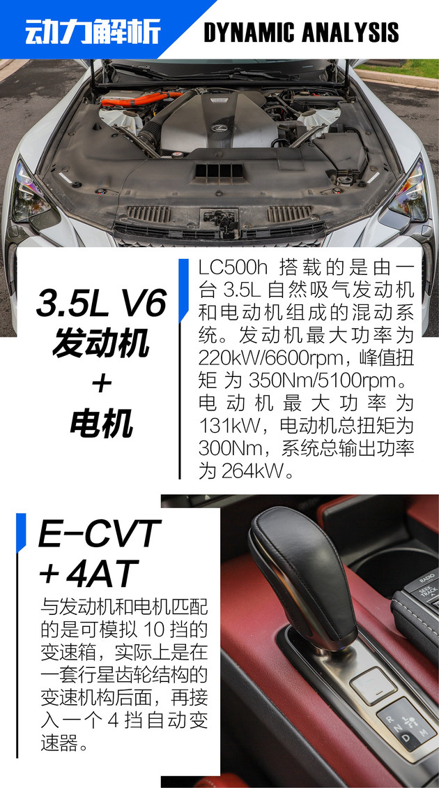 动力方面,LC500h搭载一套由3.5LV6发动机+电动机组成的混动系统,综合最大功率为264kW。新车0-100km/h的加速时间小于5秒。传动方面,LC500h将匹配一套复合变速系统,该系统在E-CVT的基础上增加了4速自动变速器,可模拟10速挡位,并带有手动模式。