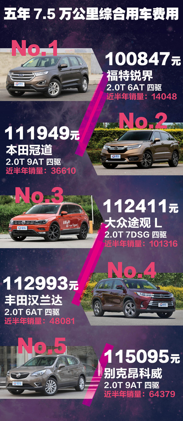 为了公平起见,参与此次汇总的五台车都采用的是2.0T四驱的动力总成,五年用车总费用由低到高排名,花费最少的福特锐界比花费最多的别克昂科威少了近1.5万元,接下来我们就看看这些费用都差在了哪。