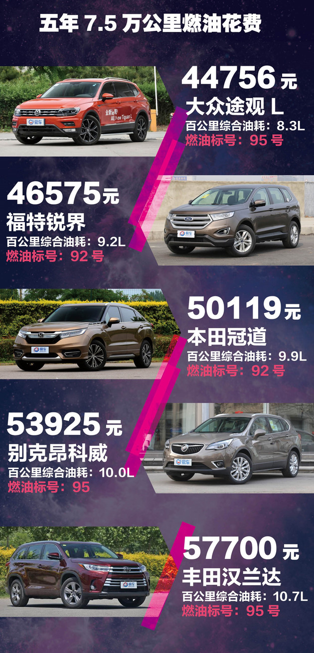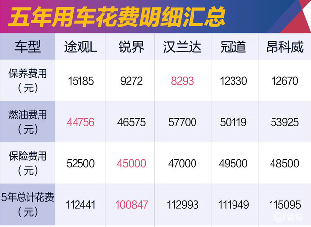 最后统计的一项是保险费用,从数据来看,途观L的保费还是相对更高一些,相比其他品牌来说,由于车价较高导致了每年的保费不低,5年保险费用需要53000元左右。紧随其后的是冠道,五年的保费也要花费将近五万元。在这里需要说明的是,保险费用的价格情况比较复杂,我们的计算方式是按照全险进行缴费,针对个人车主的话并不一定适用。而且不同品牌车型、不同保险公司给出的报价都有比较大的差别,所以我们给出的数据仅供参考。