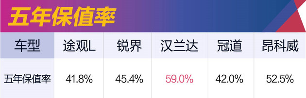 另外,二手车保值率也是一个需要考虑的问题,假设五年之后换车的话,五年保值率的高低也直接决定了总体的用车成本。换句话说,五年保值率的高低直接决定了你能否卖个好价格。从上表我们看出,汉兰达以59%的五年保值率位列第一,这已经是相当高的数值了,在所有SUV车型中仅次于“理财神器”——丰田普拉多。昂科威的表现也很不错,52.5%的数值也要优于大部分同级车型。