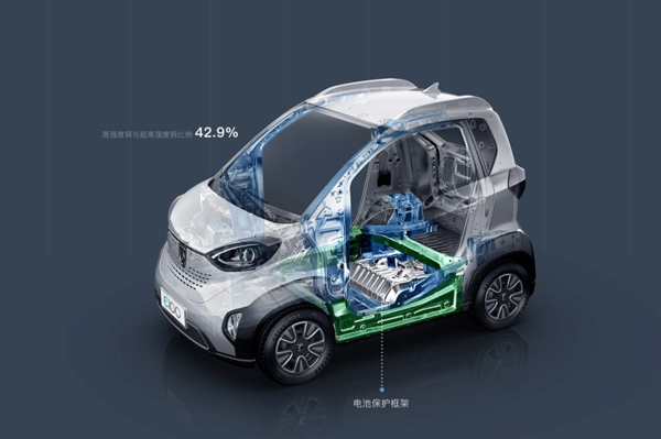 在用户非常重视的新能源汽车安全性方面,“钢铁小精灵”宝骏E100同样考虑周到, 宝骏E100的车身采用超高强度钢及高强度钢比例达42.9%,框架和笼式结构的乘员舱与电池舱能有效保证乘员安全。