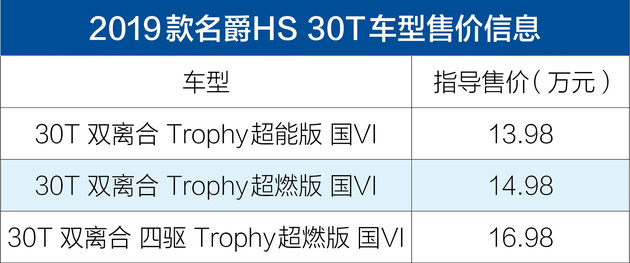 日前,上汽名爵2019款HS 30T车型上市,其将提供三款车型,搭载2.0T涡轮增压发动机,均满足国VI排放标准,指导售价为13.98-16.98万元。购买新车的消费者将有机会获得最高6000元的轮胎无忧服务、最高8000元的零利率金融助购礼等礼遇。