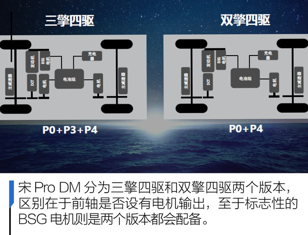 双擎四驱,是指比亚迪宋Pro DM采用了P0+P4的动力架构,能够实现EV和HEV,两驱和四驱的动力组合。