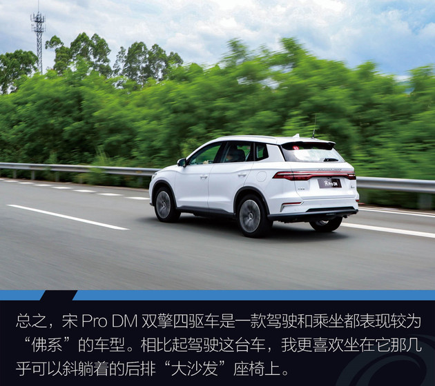 总之,宋Pro DM双擎四驱车是一款驾驶和乘坐都表现较为“佛系”的车型。相比起驾驶这台车,我更喜欢坐在它那几乎可以斜躺着的后排“大沙发”座椅上。