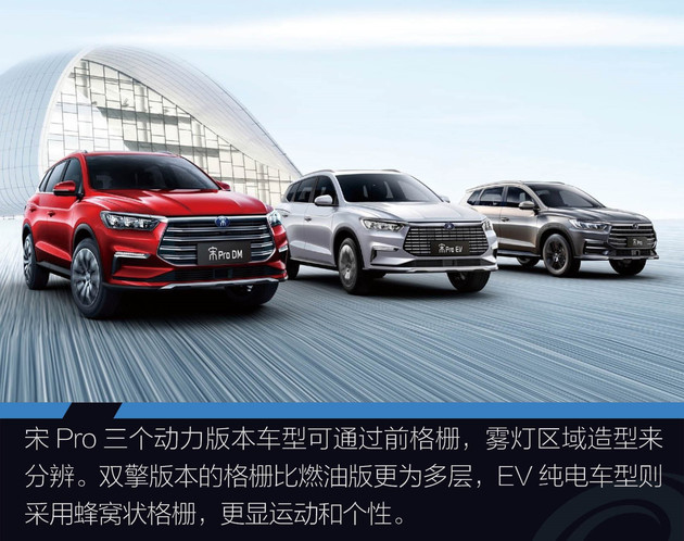 三个动力版本车型可通过前格栅来分辨,双擎版本的格栅比燃油版更为多层,EV纯电车型则采用蜂窝状格栅,更显运动和个性。