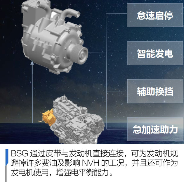 这个BSG电机充当了起动机、发电机以及动力辅助电机的角色。它在宋Pro DM身上主要有四大用处,分别为怠速启停、智能发电、辅助换挡以及急加速助力。