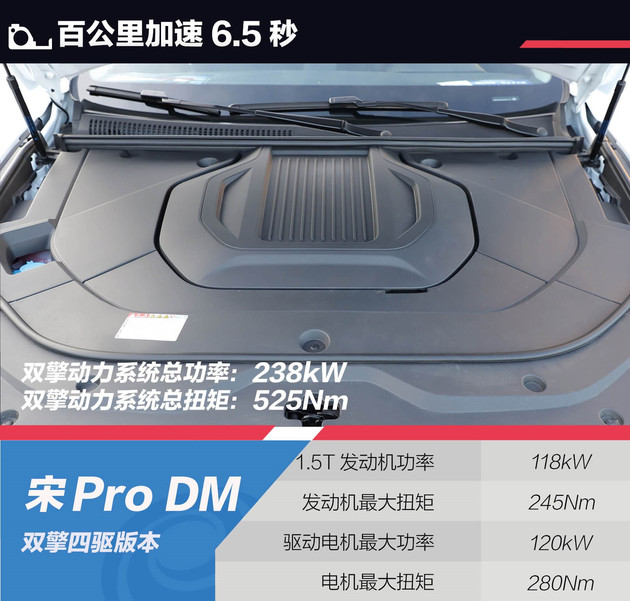 官方称宋Pro DM双擎四驱版百公里加速6.5秒,而三擎四驱版百公里加速则仅需4.7秒。