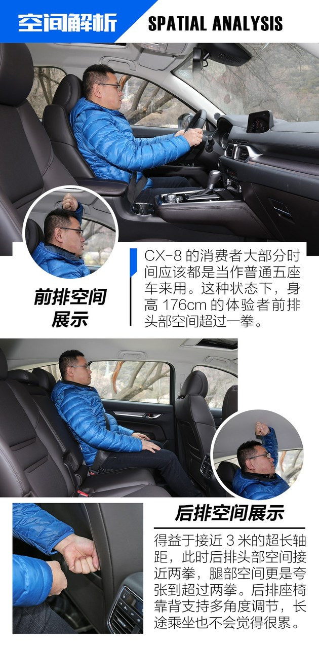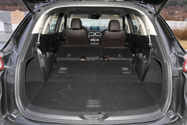 后备厢空间方面,后两排座椅都支持放倒,躺下两个成年人毫无压力,更不用说各种大尺寸的物件了,而且第三排座椅在开启的状态下,得益于接近5米的车长,CX-8依然有着可观的装载能力。