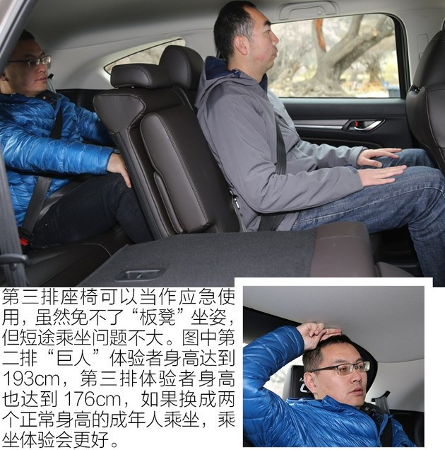 作为7座SUV,第三排自然是以应急为主,不能对它的空间表现有太多的期待,但CX-8的第三排空间除了头部稍有压抑以外,其余都感觉要比对手宽敞一些,满足170cm身高以下的乘客乘坐没有太大问题。