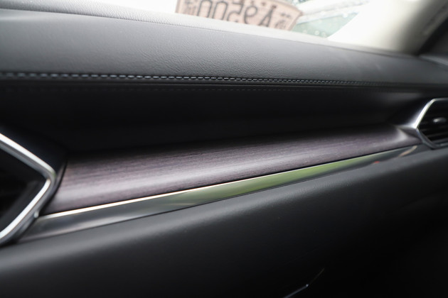 CX-8内饰的材质以搪塑工艺和少量的实木饰板为主,但是你不用手摸的话,很难察觉出来,因为它的搪塑工艺带有缝线装饰,颇有皮革包裹的观感,几可乱真,而且位于副驾及门板上的实木饰板还大有来头。