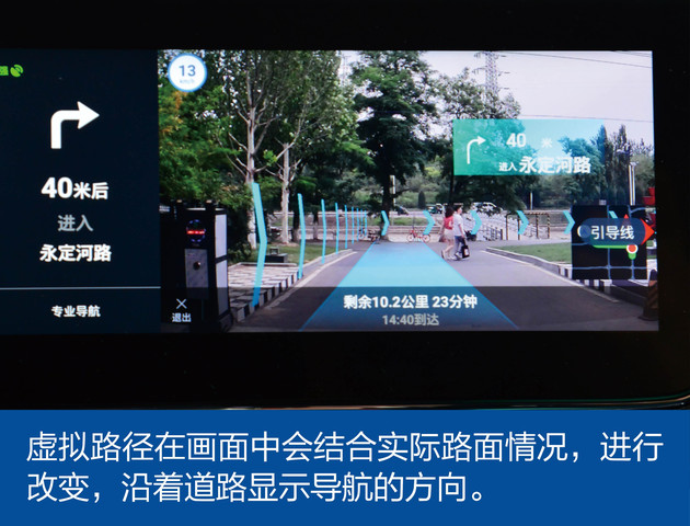 而AR导航功能则是将增强现实技术与导航功能联合起来,通过车头位置的摄像头拍摄路面的事实影像投在多媒体屏幕中,系统会根据导航线路做出一条虚拟线路显示在实景画面上,相比普通的平面地图+数字形式剩余里程的方式,AR导航的方式更加直观而且对于那些对距离不敏感的朋友来说绝对是一大福音。