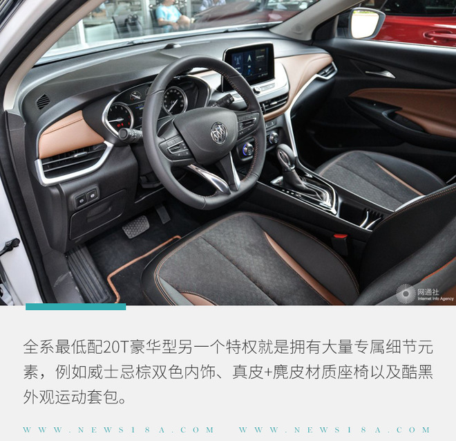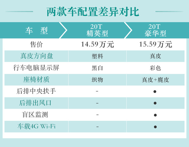 我们再来看看全新昂科拉两款1.3T排量车型之间的配置差异,两款车适合预算稍微宽裕的消费者,配置方面,作为全系最顶配的20T 豪华型相比20T 精英型多配备了后排中央扶手、盲区监测、后排出风口以及车载4G Wi-Fi,这些配置日常还是非常实用的,更何况20T 豪华型还拥有专属酷黑外观运动套包、威士忌棕双色内饰、真皮方向盘、彩色行车电脑显示屏以及真皮+麂皮材质座椅等细节,这些配置价值远超一万元的差价。