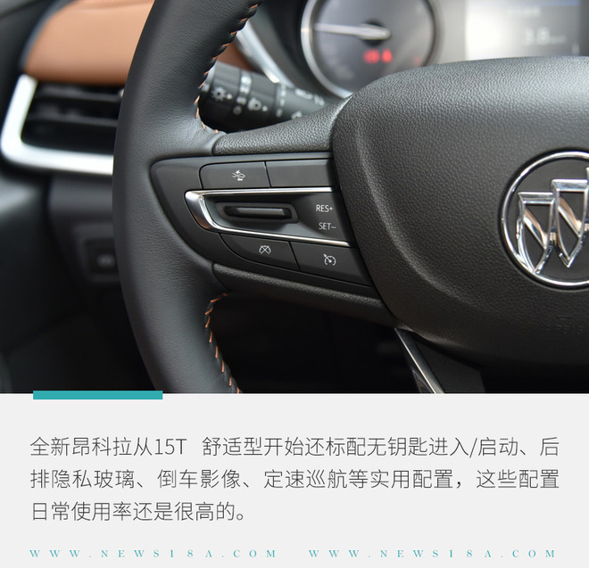 我们先来看看全新昂科拉两款1.0T排量车型之间的配置差异,可以看出作为高配的15T 舒适型相比15T 进取型多配备了车顶行李架、全景天窗、无钥匙进入/启动、后排隐私玻璃、倒车影像、后排出风口、后排中央扶手/杯架、定速巡航以及盲区监测等实用功能,且15T 舒适型的皮革+织物材质座椅,无论触感还是视觉感受都要高一个挡次,考虑到这些配置的实用性及使用频率,我们建议消费者多花一万元购买更加物有所值的15T 舒适型。