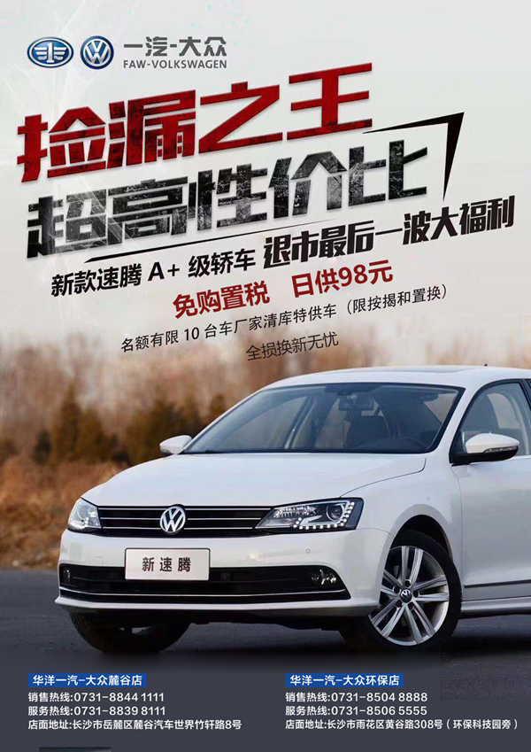 红网时刻8月16日讯(记者 唐洁琼 实习生 彭淳子)随着今年新一代速腾的上市,已经面世7年的老速腾即将退市落幕。记者从湖南华洋一汽-大众了解到,从即日起到9月30日,购买惠享版速腾将减免购置税,限量50台。
