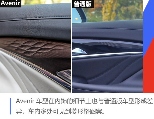内饰方面,中控台采用了别克家族最新的环抱一体式座舱设计,用料上配有真牛皮、钢琴烤漆、亮色镀铬等装饰,整体视觉效果既时尚又富有豪华感。此外,别克在昂科旗上首次引入了按键式换挡机构,不仅强调了科技感,还为中控台下方空出了更加富裕的储物空间。而Avenir在细节上加入了许多“菱形格”图案,以强调更加高档的身份。
