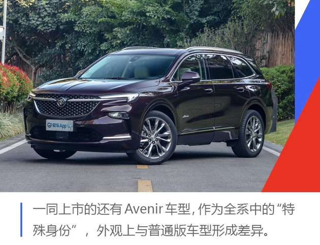 此次上市的昂科旗车系中,还推出了别克品牌中的豪华版本车型——Avenir。为强调特殊的身份象征,Avenir在外观上与普通版形成差异化。车漆采用专属的“梅洛酒红色”,其中网换为独特的“锁子甲”银色镀铬设计,车身两侧还带有“Avenir”标识。