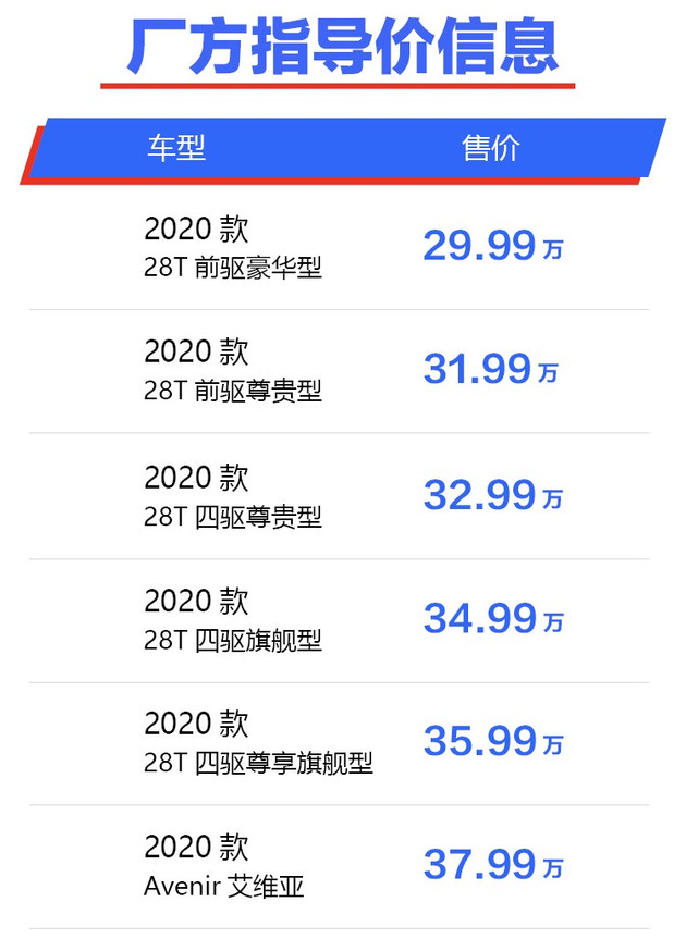 11月20日,上汽通用别克昂科旗正式上市,新车共推出6款车型,并带有Avenir版本,售价区间为29.99-37.99万元。昂科旗是上汽通用别克推出的首款中大型SUV,新车的外观和内饰均采用别克家族最新的设计语言,座椅提供六/七座布局。动力方面,新车搭载2.0T可变缸涡轮增压发动机,传动匹配9挡手自一体变速箱。