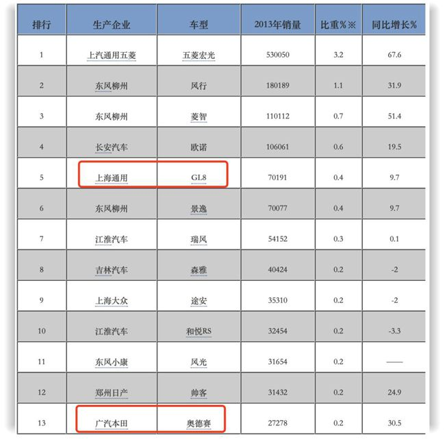 2013年MPV销量排行榜上,排行前列的中高级MPV只有合资车型