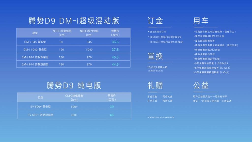 同时,腾势针对D9推出丰富的臻享豪华预订权益,预售期间下订D9的用户,可臻享多项豪华预订权益:权益一:享3档订车模式,让用户零风险享受大额现金权益。权益二:享4大用车保障,和5大智联在线,确保用户后期用车无忧。权益三:置换D9新车享20000元置换补贴,以最大诚意回馈每一位忠实用户。权益四:大礼随处可见,订车礼盒拿到手软。权益五:成功支付意向金的用户,可共同参与品牌各类公益活动项目。