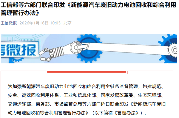 近日,工业和信息化部等六部门联合发布《新能源汽车废旧动力电池回收和综合利用管理暂行办法》(以下简称“管理办法”),提出遵循“全渠道、全链条、全生命周期”的管理思路,涵盖重点设计“车电一体报废”、建立新能源汽车动力电池数字身份证管理制度等。新规自2026年4月1日起施行。