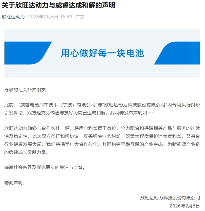 日前,欣旺达动力发布声明称,此前,“威睿电动汽车技术(宁波)有限公司”与“欣旺达动力科技股份有限公司”因合同执行纠纷引发诉讼,双方经充分沟通与友好协商已达成和解。
