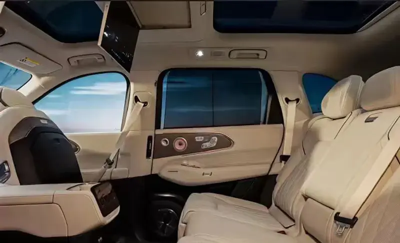 内饰方面,极氪8X采用了时下流行的简约化设计风格。中控屏与副驾娱乐屏采用一体化的联屏设计,科技感十足。此外,新车还配备前排双杯架、手机无线充电,并采用怀挡式换挡。极氪8X的后排空间极为宽敞,并且顶部还搭载了大尺寸娱乐屏,此外还配备了Naim音响系统。