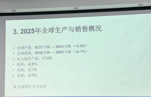 “2025年,全球汽车产销量保持增长态势,产量达9640万辆、销量为9980万辆,但市场复苏呈现区域分化,不同国家和地区增长不均衡,部分市场实现稳步回升,部分地区仍面临下行压力。”国际汽车制造商协会秘书长弗朗索瓦·鲁迪耶4月23日发布了全球汽车产销数据。