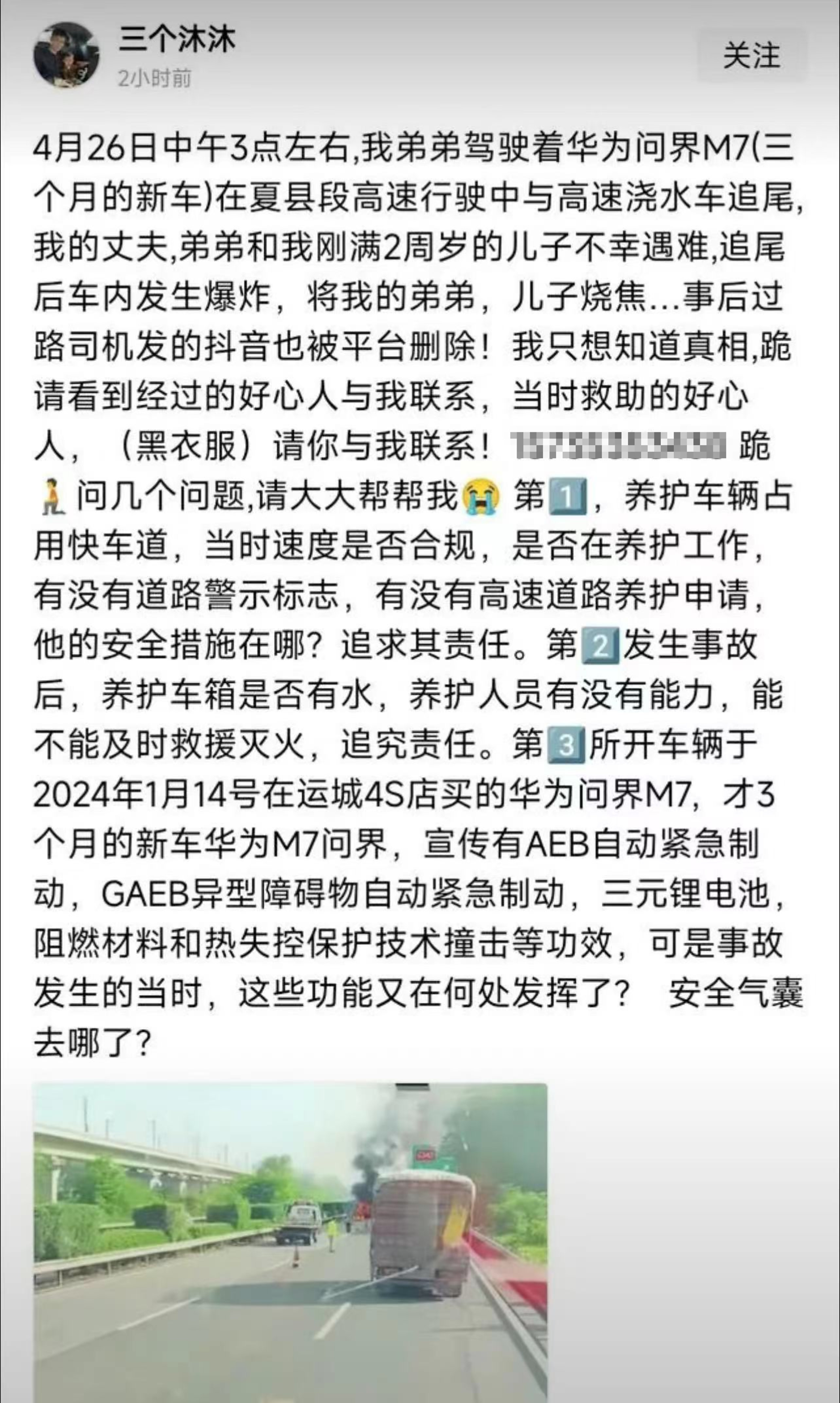 4月27日,ID为三个沐沐的网友在社交媒体发帖称,她的弟弟驾驶华为问界M7在山西省夏县段高速行驶,在超车道上与前方洒水车追尾后起火,她的丈夫、弟弟和刚满2周岁的儿子遇难身亡,此事引发网友热议。