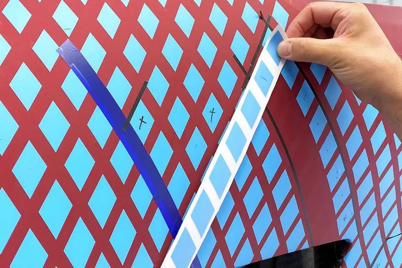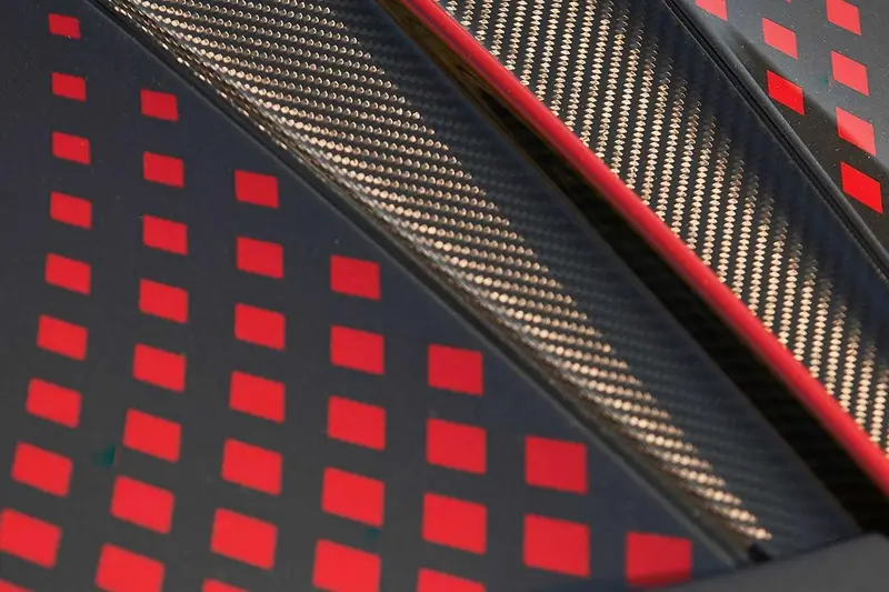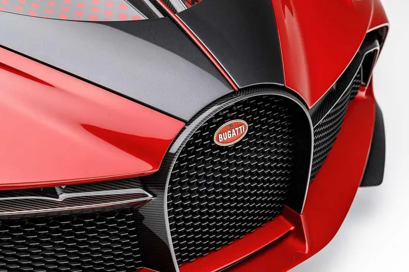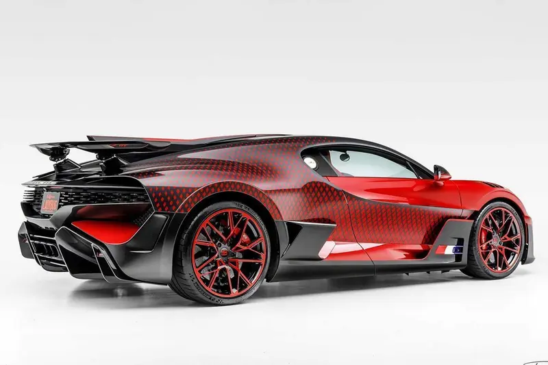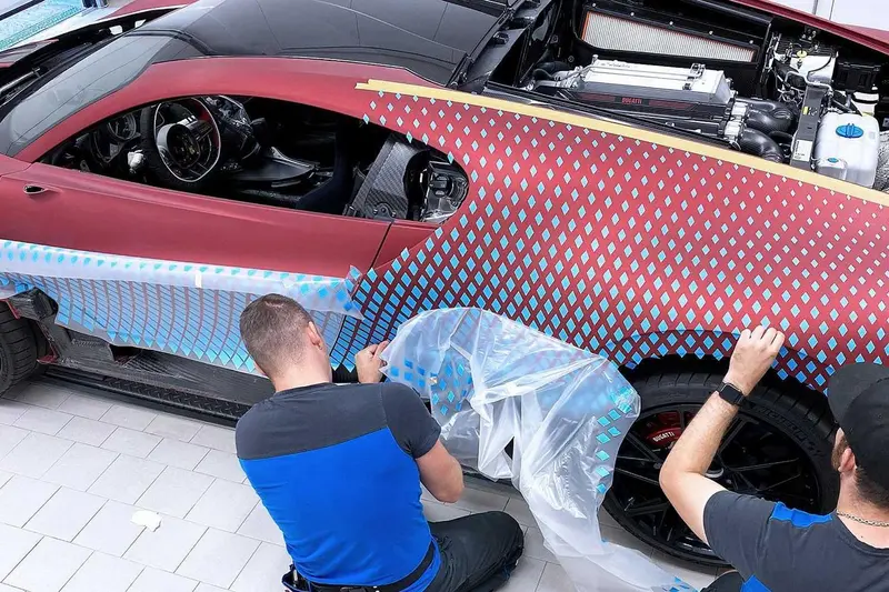 布加迪对这个复杂对过程进行了多次测试,确保效果满意之后再在客户的汽车上进行施工。这当然不是简单的拉花或图案,为了创造这种效果,布加迪将车身底漆涂成红色,然后在外部敷上转移膜,用转移膜将经过精确的测量和比对的菱形图形贴到车上,确保每一刻菱形之间均匀有序的间距,和不被拉伸变形。