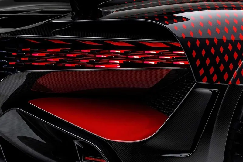 在车身细节上,布加迪Divo使用了黑色的车身空气动力学套件和黑红双色的轮圈来配合车漆的效果,而独特的尾灯在点亮时,投射到黑色车上的形状,也恰巧呼应了红色的菱形图案。