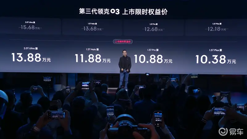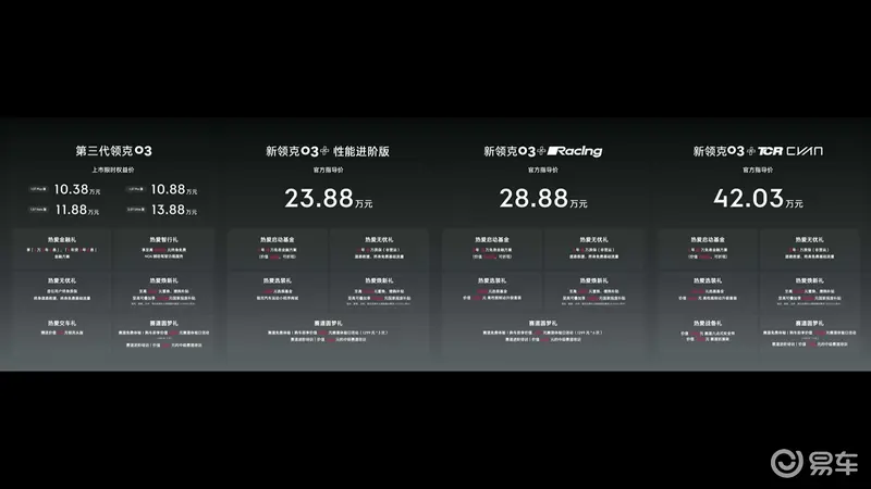 10月17日,新款领克03家族正式上市,其中第三代领克03售价12.18万-15.68万元,上市限时权益价10.38万-13.88万元,新领克03+售价23.88万-42.03万元。新车在外观方面设计更加运动,并增加了千里浩瀚辅助驾驶H3方案等科技配置。