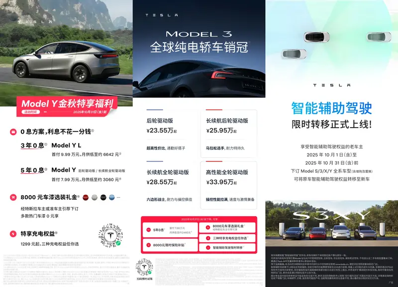 日前,特斯拉推出了全新购车政策:在10月31日前下单Model Y和Model 3,可享“5年0息”(Model Y L可享“3年0息”)、8000元车漆选装礼金、1299元特享充电权益,以及“智能辅助驾驶限时免费转移”等多重金秋福利;Model 3指定版本车型还可以叠加享受8000元限时保险补贴。