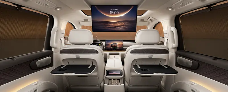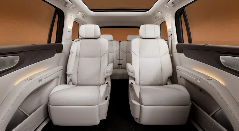 车辆二排将配备零重力座椅,提供小桌板、头顶娱乐屏、冰箱以及功能控制屏。此外,新车还设置了B柱拉手,方便儿童、老人下车。三排配备了双扶手、一键电动折叠、座椅加热功能。