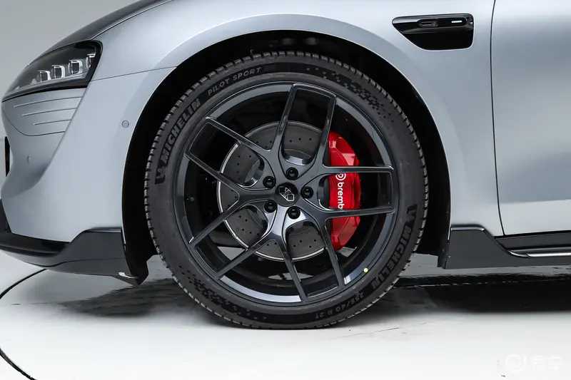 车身侧面,新车整体造型颇为饱满,在大溜背布局和隐藏式门把手、无框车门以及哑光镂空双五辐式轮毂等设计细节的加持下,能充分展现其侧颜的动态美感与时尚成分。